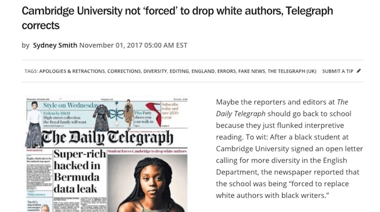 UK newspaper the Daily Telegraph caused a stir in October with a front page story about a black Cambridge student who had “force[d] Cambridge to drop white authors”. The Telegraph‘s coverage wasn’t so much a dog-whistle as a flashing neon sign saying “uppity”. Of course Lola Olufemi, who wrote the open letter in question, had said no such thing. In fact the Telegraph had to write a hasty clarification, which it buried in the arse end of the paper.