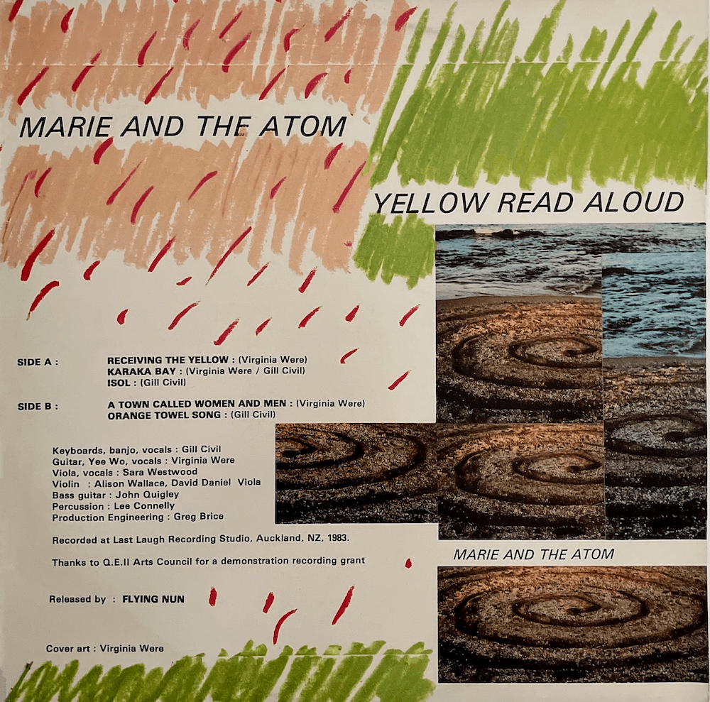 Calling themselves Marie And The Atom, the duo’s early live appearances included a performance piece called ‘Yello Yello’. They then secured a modest $200 QEII Arts Council recording grant to make their debut EP in mid-1983. Working at Last Laugh with Greg Brice, they recorded five songs for an EP titled Yellow Read Aloud, which included two songs apiece from Civil and Were along with the co-written ‘Karaka Bay’. Helping out were many of Civil and Were’s friends. John Quigley, who had played with Civil in The Bongos, played bass on ‘Isol’. Sarah Westwood, a friend of Were’s from art school, added viola and backing vocals.