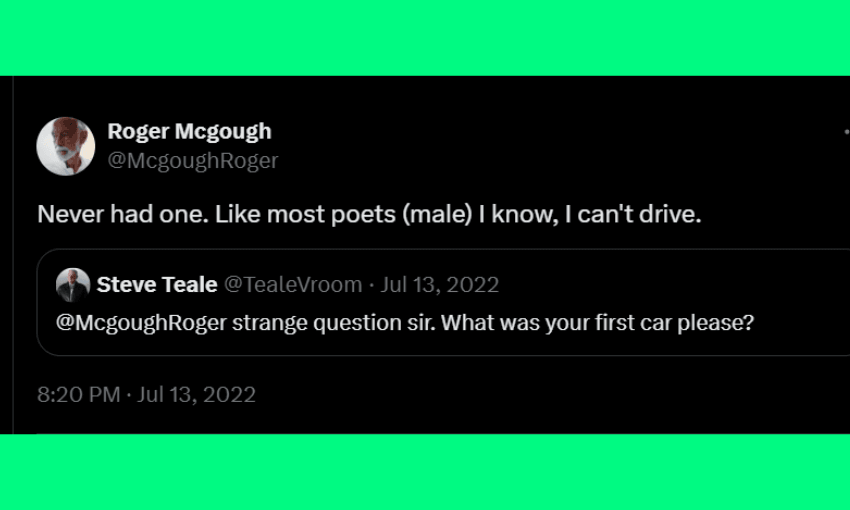 Another UK poet confessed that her driving test was so bad that her driving instructor recommended she didn’t learn to drive.