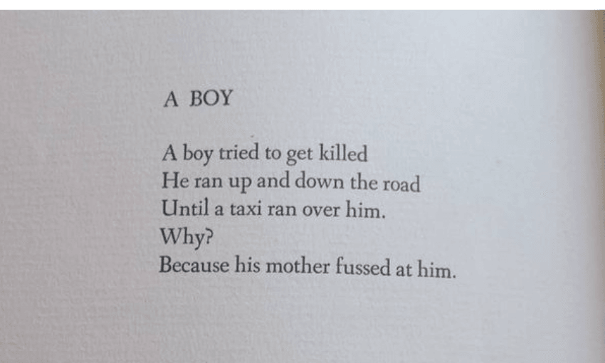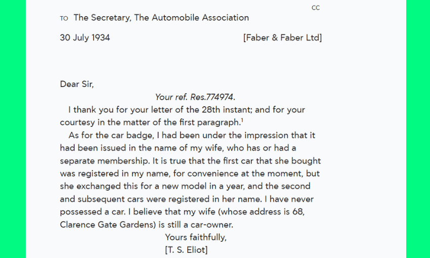 It turns out, it’s pretty hard to find information about whether 20th-century poets could drive. It doesn’t help that Google’s search algorithm is fully enshittified. I tried to confirm a rumour that Will Self can’t drive, and got thousands of results for “Will self-driving cars soon be a reality?” I discovered contemporary racing car drivers named Dylan Thomas and James Baldwin. I spent a long time trying to figure out if Bill Manhire could drive, until I finally stumbled across a blog post Paula Green had written about his personalised number plate. In retrospect, I should simply have asked Toby.