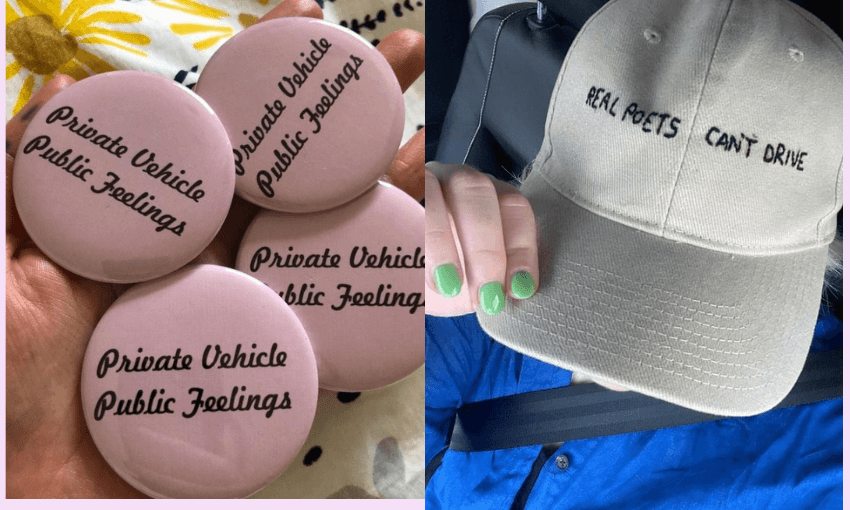 Perhaps the most compelling reason to learn to drive is simply the merch. Maybe one day I will be the proud recipient of one of Stacey Teague’s iconic badges which she distributes to New Zealand writers with wheels. The badges are pale pink, and emblazoned with words by Rebecca K Reilly: “private vehicle, public feelings”.