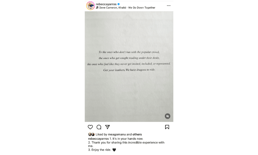 “Get your leathers, we have dragons to ride,” goes the epithet inside the third instalment of Yarros’ megaselling The Empyrean series which has just been unleashed (and already has 18,959 ratings on Good Reads). The first book in the series, Fourth Wing, soared like a golden feathertail dragon to the top of the Amazon and NYT bestseller lists, making Romantasy one of the biggest genres of the age and Yarros one of the biggest authors, ever.