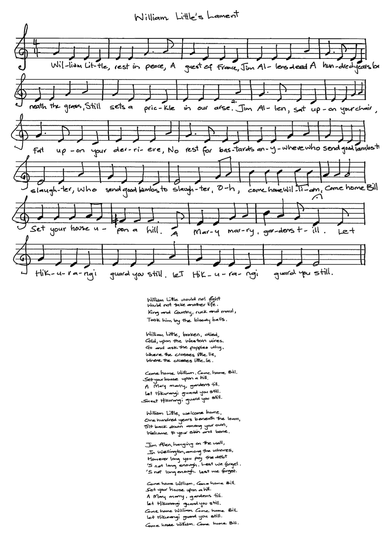 I’ve brought you a song as well. It seemed the least I could do. Maybe there’s a kid out there somewhere who will find it. Play it for you on their recorder. Especially on Anzac Day. Drown out the bugles. I’ll have a crack at it singing it for you tomorrow anyway. Just by myself. At the going down of the sun. And in the morning. It the only medicine I’ve got left at the end of the day, brother. Lest we forget. And all that.