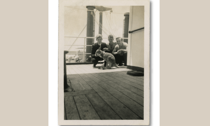 “Nothing exciting,” my dad would say, and then he would talk about the kangaroo they had on the ship. The kangaroo had been kidnapped in Townsville in 1940. It was still on board when the ship left for the Victoria Docks in London. There’s a photograph of the kangaroo in my father’s album. If you look closely you can see the crew have made a harness for it. They are rather proud of Joey, their new ship’s mascot. You can also see that it was really a young wallaby, not a kangaroo at all.
