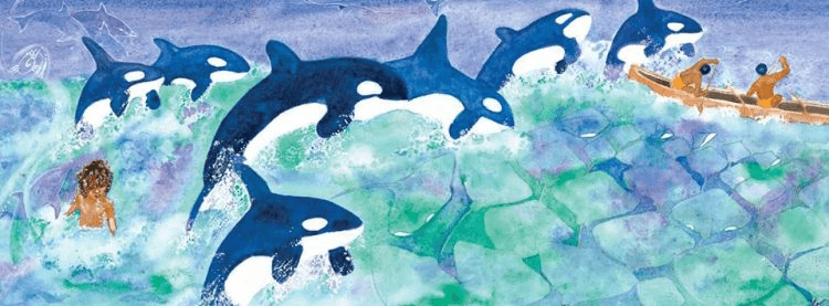 Each part of this book is wonderful. The pictures have real artistry to them, capturing the attention of both adults and children. On the first page spread, I counted 13 different native birds, plus assorted sea creatures. More appear as the story unfolds.