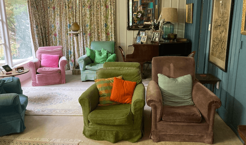 The green chair at the end of the room was her favourite place to write (that or the floor, we’re told). She’d write at night in longhand in green ink, and then would give her notes to her secretary in the morning to type up on the typewriter. David pulls back one of the armchair covers, faded from decades in the sun, to reveal the original vivid emerald velour. While bright colours pop through the house, Marsh clearly had a thing for green – green ink, green chair, green kitchen… even her housekeeper was named Mrs Greene.