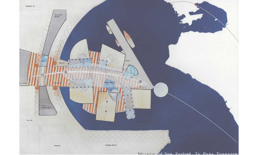 Now that I’ve talked about museums, allow me the most inelegant segue into some of the Rewi projects that really piqued my interest: Capital Discovery Place Te Aho a Māui (with Athfield Architects), City to Sea Bridge (with Athfield Architects, John Gray and Paratene Matchitt), and the national museum design competition entry (with Ian Athfield and Frank Gehry). Wellington was my home for 18 years, and my relationship with these civic spaces evolved over that time. As a mother desperately finding places to feed and entertain young children (and myself), I learned how to navigate the intermediary spaces between the library, City Gallery and Te Papa. As my babies grew to toddlers, they’d break free from their prams and clamber over the Para Matchitt-made structures and barrel down the split of what I’ve come to know as Rewi’s pyramid.