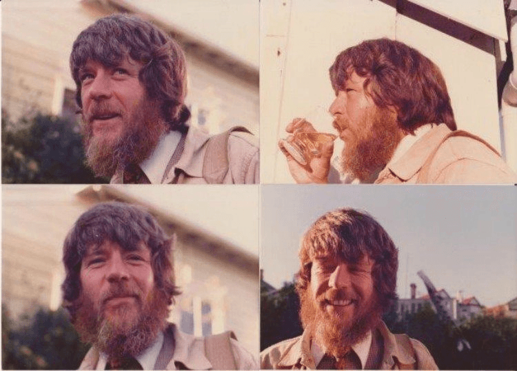 In real life it’s Jean Haley who knows a lot about trees and other plants, and who has always made gardens. Russell loved trees, especially natives, and had an encyclopedic knowledge of their Maori names, and Jean and he planted a great many of them; but I think it was Jean who taught him their botanical, Latin names. Ian describes his mother as “an unsung horticultural genius”. Russell also loved birds, and there are many in his stories. They both loved dogs and had lots of them. Back at their place in Whangarei, there’s now a montage of photographs of Russell, often with Jean and the kids and with friends in different parts of the world—Russell is often playing with a dog. In the story “Dogmaster”, the protagonist pawns his dog Zero every day. Then, one day, he liberates Zero from “the broker” early. The story ends like this:
