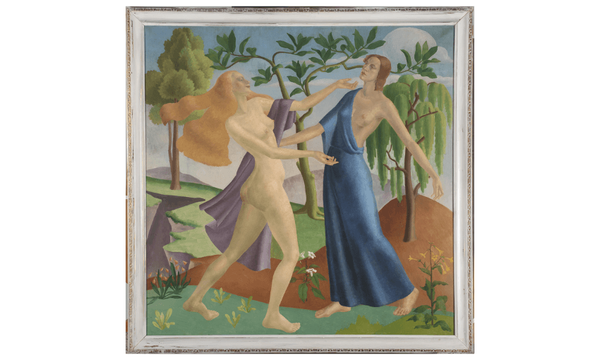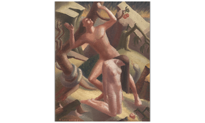 White’s Expulsion, circa 1939, was, like Winter’s Approach, painted as world war loomed. The parallels and connections between the two works shimmer and fizz, not unlike the rhythms and patterns she puts in play within each painting itself. In the Greek myth, Persephone eats the forbidden pomegranate seeds, and so is charged to return each year to the world of the dead. Likewise, Eve eats the forbidden apple, and is punished with mortality. In Expulsion, White shows Eve kneeling in shame, in stinging nakedness, a degraded penitent in a spectacle wrought by a de Sadean god. Her hair is a fig leaf to Adam’s manhood and the offending fruit lies abandoned before her, while two remaining apples hang like balls on the Tree of the Knowledge of Good and Evil.