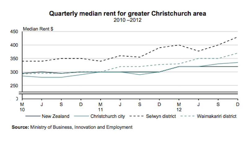Rental affordability describes the relationship between rents and wages, the government statistician says. In short, when a region (like Auckland) has high rents and low wages you have an affordability issue. And in Christchurch it was found that “the percentage change in median rents in the greater Christchurch area between 2010 and 2012 was more than double the 5.2 increase in median equivalised weekly household incomes for Canterbury in the same period”. So rents went up by more than double the amount that wages did.