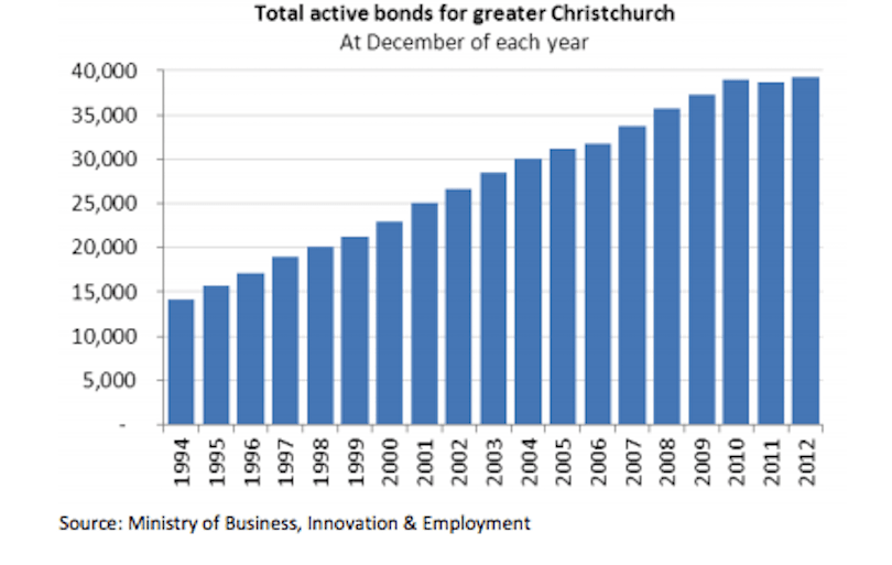 The number of rentals in the private market, as measured by the number of active tenancy bonds held static at 39,000 during 2011 and 2012. But since the earthquakes, the total number of rental bonds lodged with MBIE fell from 20,500 in the year to December 2010 to 16,600 in the year to December 2012 (a 19% decrease), and the number of new bonds lodged in 2012 was the lowest annual number since 1998. Most tellingly, “most of the decrease in available rentals was driven by the loss of two- and three-bedrooms rentals, which traditionally make up the majority of the Christchurch rental market”.