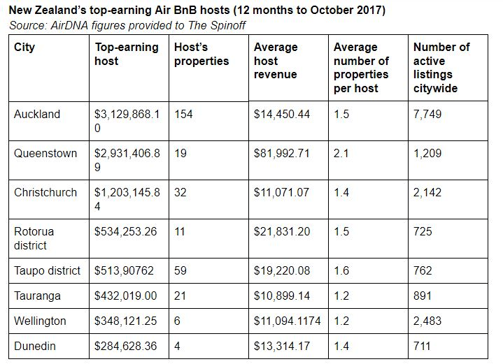 In tourist playground Queenstown, one Airbnb host made $2.9 million in the year to October accommodating short-term stays across 19 properties, according to new figures from research agency AirDNA.