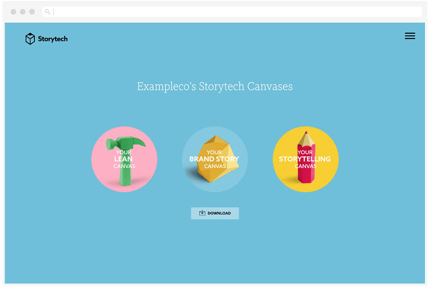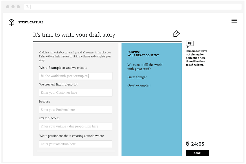 The process centres around three ‘canvases’ (one-page documents that capture fundamentals about the brand in a way that’s easy to understand and share) that users spend the day working through. Once the canvases are completed, users take the content they’ve developed and use it to complete a ‘fill in the blanks’ brand story template. So they end the day with a new and fully written brand story, as well as a plan for how to communicate it to customers.