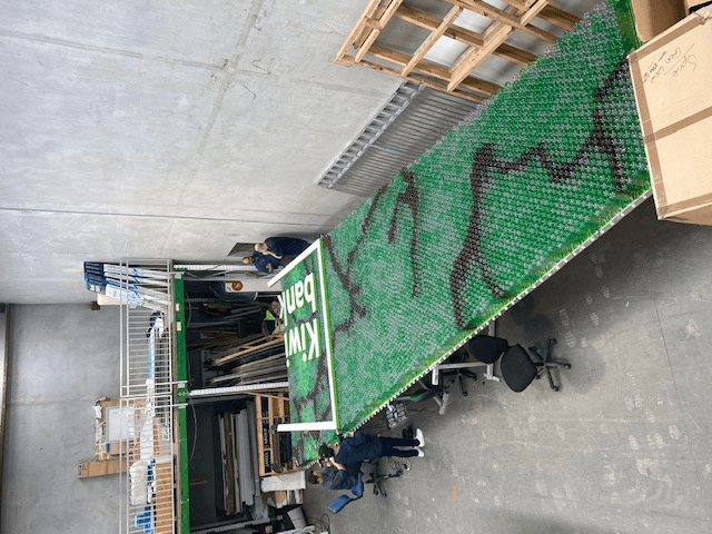 Not individually of course; they’ve been integrated and woven into a large, one-of-a-kind, LED-backlit sign sitting at the top of the building. Starting with Tangaroa College students collecting bottles from Eden Park, the sign took almost a year to craft and was designed to showcase what waste could be turned into with the right kind of ingenuity. According to the lead designer, Danielle Barclay from 99, Kiwibank was looking for a unique piece of signage that reflected the sustainability aspects of the new building.