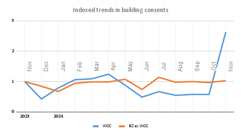 Since November, there has been a sharp spike in resource consent applications for new dwellings in the Wellington City Council area. After averaging 26 new dwellings consented per month, WCC approved 87 new dwellings in November. It’s a major outlier compared to the relatively slow rate of development happening elsewhere in New Zealand amid poor economic conditions and high interest rates.