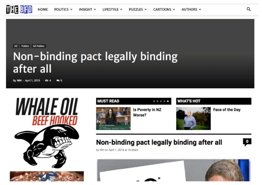 Many posts on TheBFD site are duplicates of those that were being posted on Whaleoil, starting from April 1 this year. For example, this post about the UN Global Migration pact is essentially identical on both TheBFD, and Whaleoil.net.nz, with slightly different text formatting.