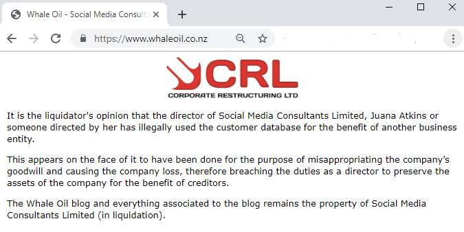 The Whale Oil blog and everything associated to the blog remains the property of Social Media Consultants Limited (in liquidation).