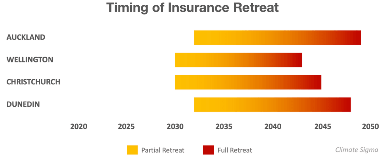 Storey says the moment of truth could come sooner than many expect, in part because our insurers and banks “roll” their loans and insurance contracts with homeowners every year or two, giving homeowners here much less planning leeway than many overseas. The highly leveraged nature of New Zealand’s housing market means that any denial of insurance inevitably makes the house unbankable (the banks won’t lend on it), dramatically reducing its potential value.