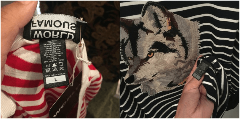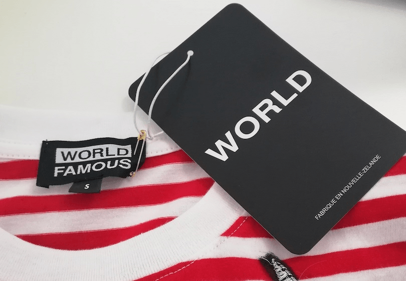When The Spinoff revisited an Auckland WORLD store, we found 10 t-shirts with sequin or embroidered patches. All 10 had care instruction labels stating where the garment was made on the inside seam, near the hem and out of sight. Only the sample t-shirt that The Spinoff had already purchased had the place of manufacture where the consumer could see it clearly. This is not unusual. A lot of clothing companies won’t include the place of manufacture on the collar tag. But what the Bangladesh-made WORLD t-shirts did have were highly visible cardboard tags stating “FABRIQUE EN NOUVELLE ZELANDE”. Made in New Zealand.