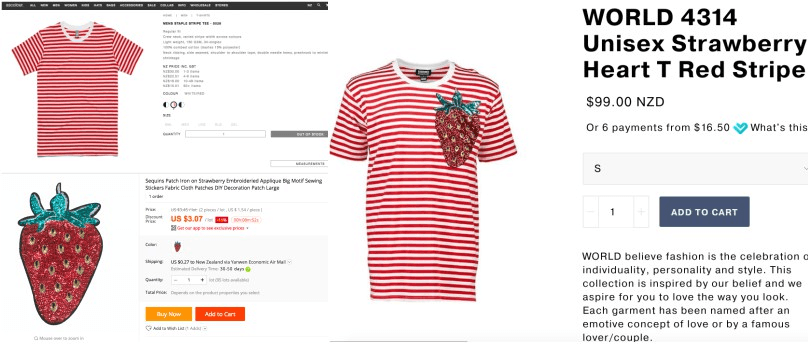 The sequin patches that have been sewn onto the t-shirts at WORLD can be found on AliExpress, sold by the same vendor, TongLiang Boutique Store. They did not answer any of The Spinoff’s questions about their factory and working conditions.