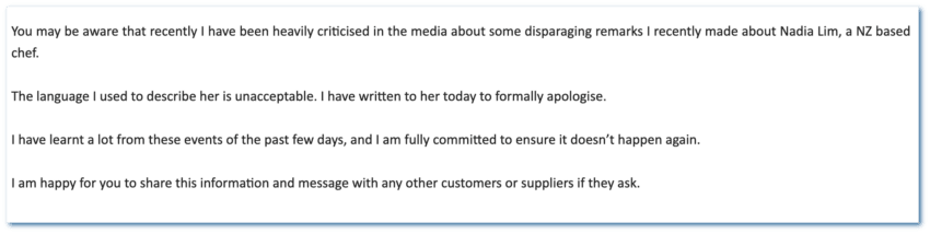 The head of chemicals manufacturer DGL, Simon Henry, has finally acknowledged the appalling comments he made about My Food Bag’s founder Nadia Lim. But despite claiming he’s apologised to her, Lim says she’s yet to hear anything from Henry.