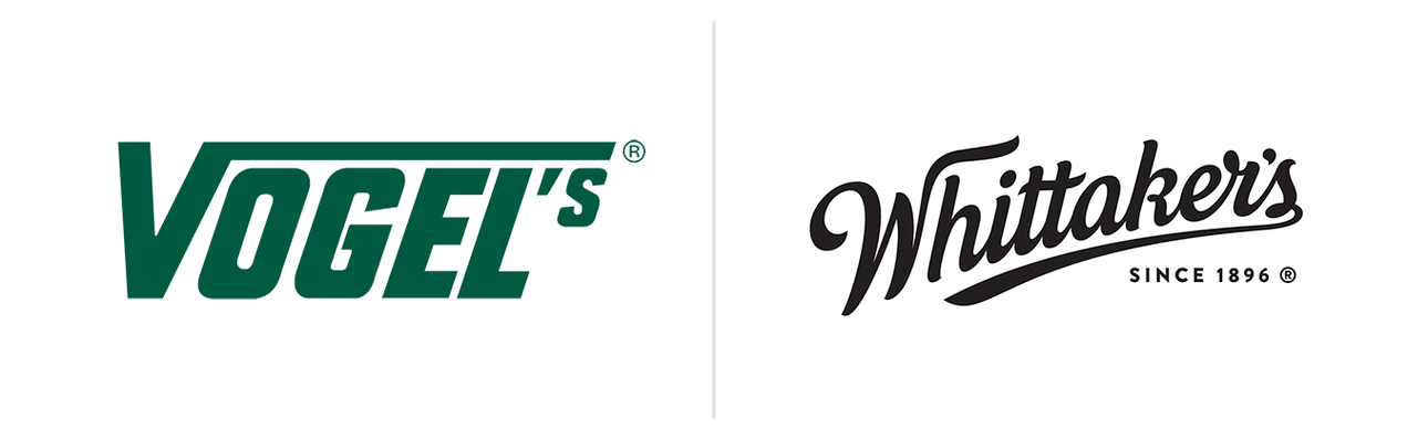 I’m putting these two classics together to compare and contrast. Two beloved, trusted family brands; two classic custom wordmarks. Both tell you “traditional family business”, but compare the styles: the strong neat lines of Vogel’s says “traditional, reliable, hearty” while Whittaker’s elegant flow says “traditional, luxurious, delicious”. Both are perfectly crafted and both perfectly fit their product. Excellent work.
