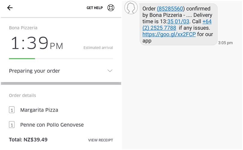 For the sake of simplicity, I decided to exclude all other food delivery competitors from the test, such as local startups LazyAz and Deliveryeasy (the latter was also ruled out because their restaurants only delivered from 5:00 pm onwards). For the sake of fairness, I ordered from the same restaurant (Bona Pizzeria in Ponsonby) and requested one pizza and one pasta from each platform so that both drivers would have the same amount of food to wait for and carry. Lastly, I placed both orders at exactly the same time (1:00pm) with instructions for it to be delivered to The Spinoff’s CBD office.