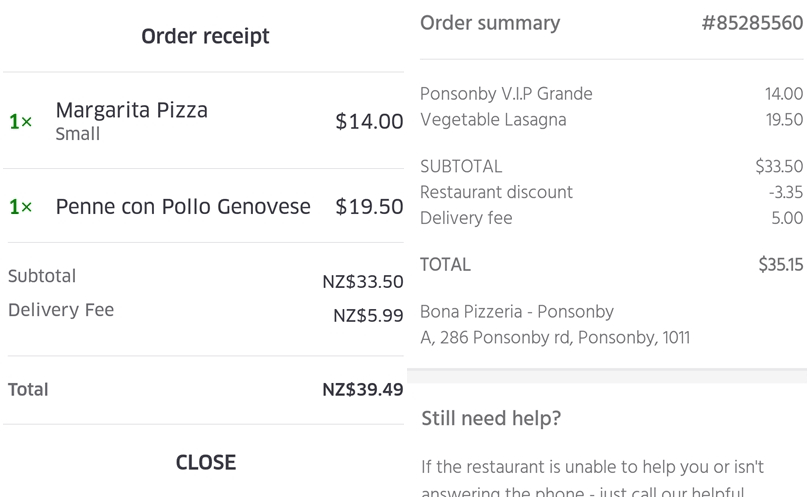 Both orders consisted of two items each: a pizza ($14) and pasta ($19.50) totalling to $33.50. With UberEats, delivery was an additional $5.99 which is standard across all its restaurants and locations. For Menulog, delivery was $5, which meant the former cost $39.49 and the latter cost $38.50 — the latter being a mere dollar cheaper.