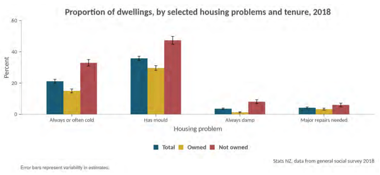 Very. According to the 2018 census data, which thoroughly questioned New Zealanders on the quality of their homes, around one in five homes were damp sometimes, and one in five New Zealanders lived in a home that was always or often too cold in winter, but this rose to around two in five Pasifika and Māori.