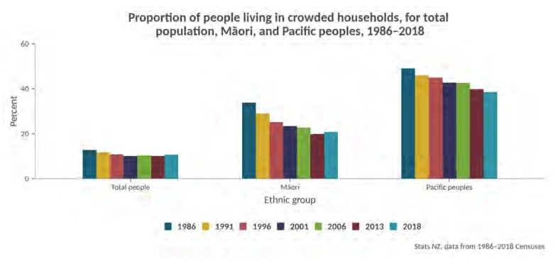In terms of crowdedness, around one in nine New Zealanders lived in a crowded house in 2018, with the highest rates of crowding among Pasifika people.