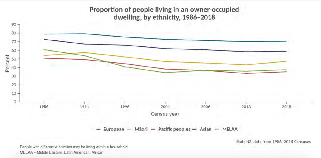 The data was even more skewed when viewed across ethnicities. While every ethnicity experienced a decline in home ownership, Māori and Pasifka households saw the most severe drop and were more likely to live in damp and unhealthy, or overcrowded homes.