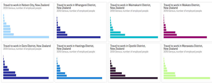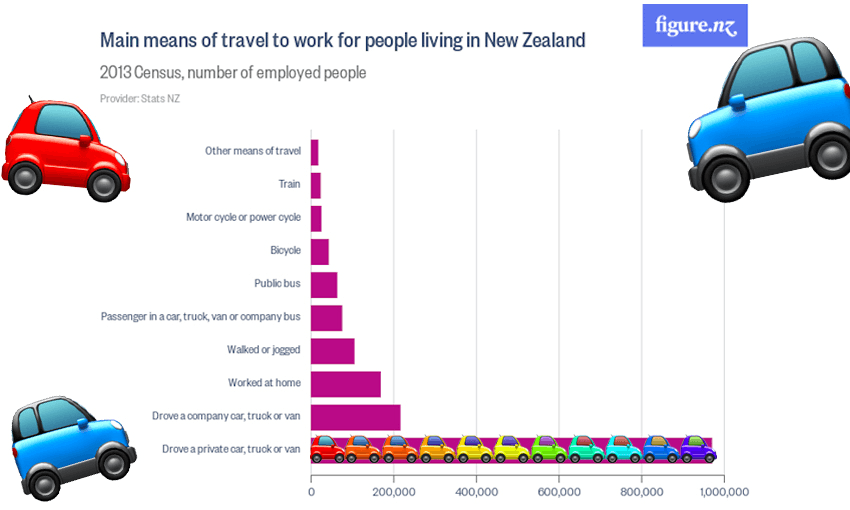 You’ve just gotta look at the graph below. The big bar thing covered in little cars is huge – that’s us in our cars. In total, not far off a million New Zealanders drove to work in a private car, truck or van according to 2013 Census data. The next highest option, a company car, truck or van (do we see a pattern here?) saw 217,404 of us clocking up the miles. If you’re looking for an outlier, Mackenzie District’s work-at-homers weren’t far behind those commuting in a car, with 516 smart people opting out of the office compared with 690 traditional car/truck or van travellers in the beautiful region.