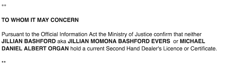 One of the things I discovered is that to operate an antique’s store, you need a second hand dealer’s licence. Surprisingly, an Official Information Request to the Department of Justice back in March found that neither Jillian Bashford or Michael Organ of Bashford Antique’s held a secondhand dealers licence.
