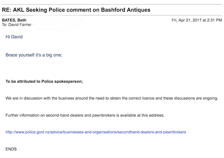 I asked if the police planned to investigate or prosecute Bashford Antiques. The statement I got in return was pretty short. To their credit, the Police Media Comms team appeared to have a sense of humour, prefacing the official statement with “Brace yourself, it’s a big one”. The official statement bit read: