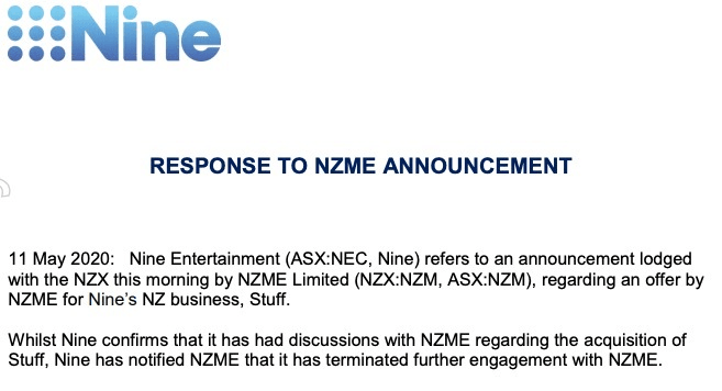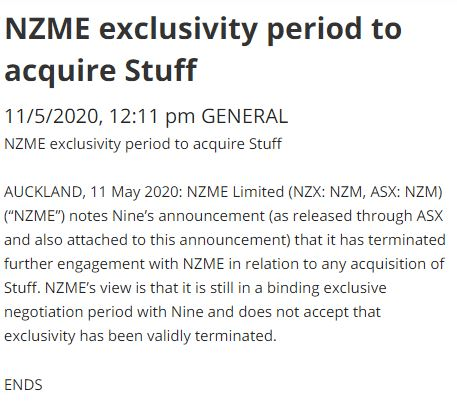 It didn’t stop there, with NZME posting a follow-up announcement just after noon, asserting that it remained”in a binding exclusive negotiation period with Nine” and “does not accept that exclusivity has been validly terminated”.