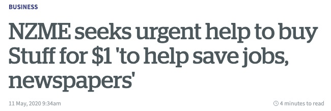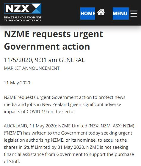 The episode began through a story on the NZ Herald site, one of a large number of media properties owned by NZME, which stated that it had filed an urgent application with the Commerce Commission to be given permission to buy its rival. It cited a price of $1, which would exclude certain non-media assets, but include all its liabilities, and a date of settlement of May 31.