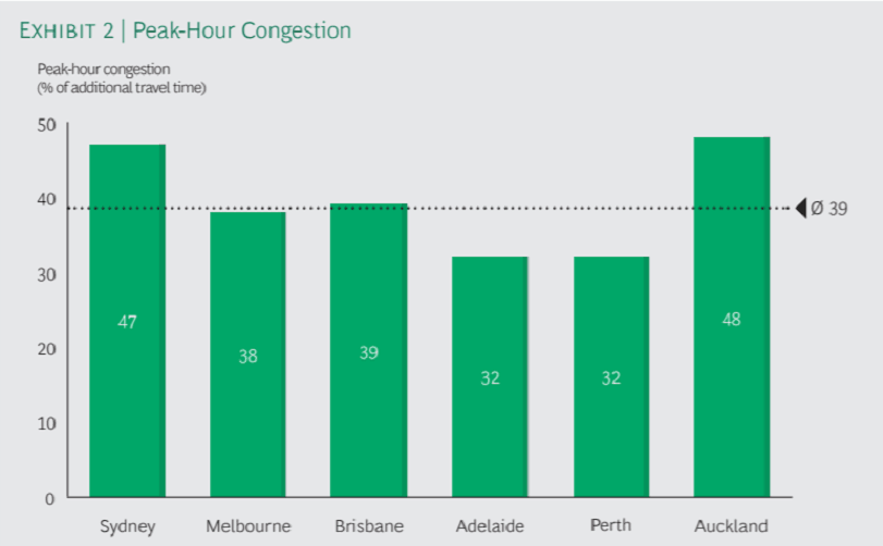 Turns out Auckland’s rush hour traffic is even worse than Sydney’s, and is significantly worse than in Perth, Adelaide, Brisbane and Melbourne. Travelling at the Perth peak will take you 32% longer than at other times, but in Auckland it’ll take almost 50% longer.