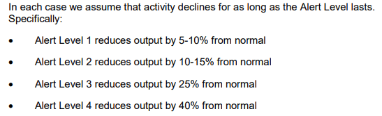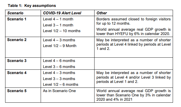 They’ve basically mapped the Covid-19 alert level system on to economic activity, on the grounds that higher alert levels mean lower levels of activity. They also consider the potential for the borders to be closed for a year, and take into account world economic activity. Here are the yardsticks Treasury is working with: