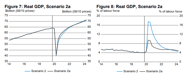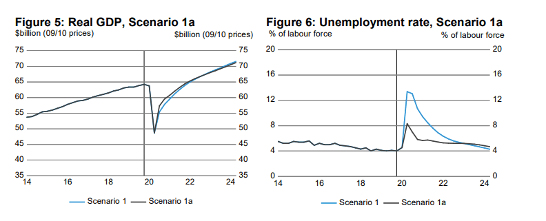 That was also modelled, with two options put forward – an additional $20 billion of stimulus and an additional $40 billion of stimulus. Because of the constraints on economic activity imposed by the lockdown, they aren’t necessarily reflected that strongly in GDP. However, there is a clear impact on the unemployment rate, as these graphs show: