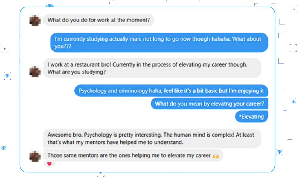 The man who recruited Noah would look over his posts before they went live, as well as his messages to potential recruits, and give him feedback or suggest changes. “I always wanted to share authentically. But if someone’s always editing your messages, then it’s not really authentic.”