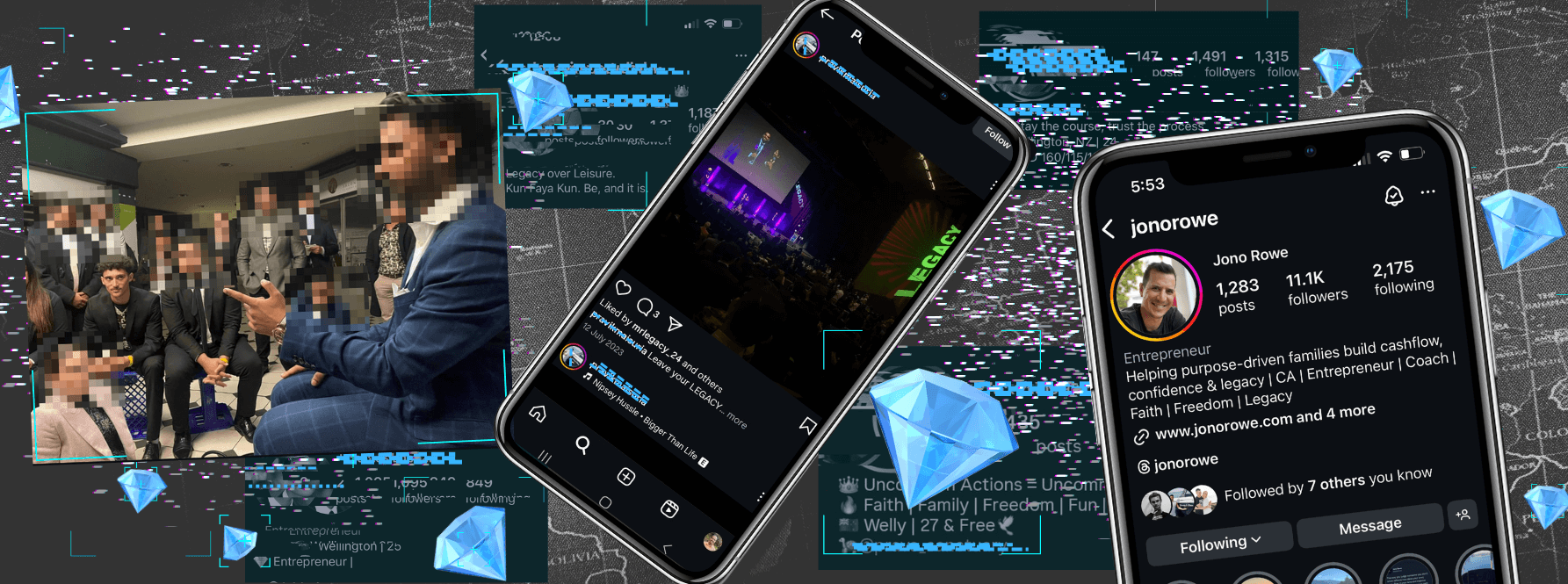 You see group photos of them at a business conference in Melbourne, with a receipt-length caption about “becoming free from the 9-5 grind”, so you click on the tagged accounts.