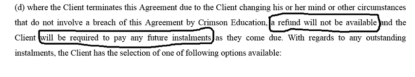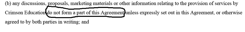 The document says that any “discussions, proposals, marketing material or other information” do not form part of the agreement. AUT contract law expert Mike French says this is known as an ‘entire agreement clause’ and means that promises Crimson makes in the course of its publicity and marketing activity are not necessarily part of the deal. The contract also makes clear that Crimson “does not guarantee academic performance, results scholarship awards or offers of entry to universities”. Crimson claims that its students are up to four times more likely to gain entry into top schools such as Harvard and that it has achieved over 250 acceptances to Ivy League and Oxbridge universities since 2013.
