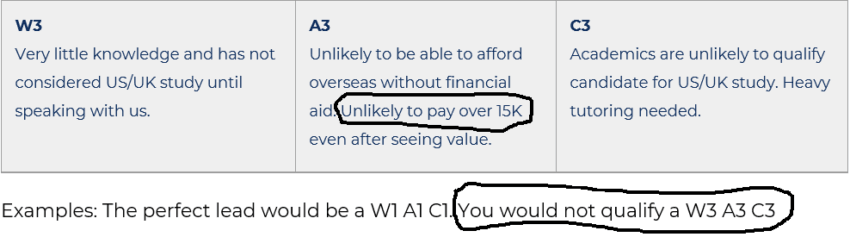 Crimson sales representatives are instructed to score potential client families on their “willingness (W), affluence (A), and candidacy (C)”. An affluence level of A1 is someone who is “able to afford $30K+ package”, with the “cost of program not primary concern”. Conversely, an A3 prospect is “unlikely to pay over $15K”. Prospective customers are similarly scored on how keen they are (willingness) and the academic results of their children (candidacy).