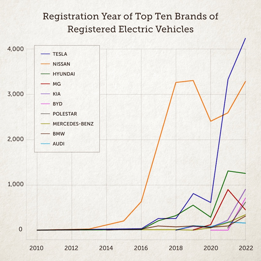 The 2022 growth has been driven by three factors: the introduction of the government’s clean car discount scheme, the popularity of the new Tesla models, and the continuing decline in popularity of petrol and diesel cars, which have been steadily declining since late 2017.
