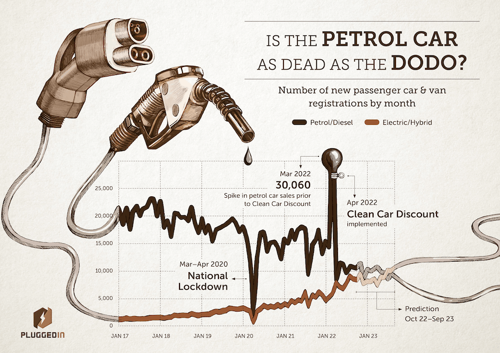In one last fit of rebelliousness, 15,295 more petrol and diesel cars were purchased in March 2022, compared with the monthly average, to avoid paying the high emissions vehicle fee introduced on 1 April, dubbed a “ute tax” by opponents of the scheme. The exhaust-fuelled high did not last, with the sale of petrol and diesel cars dropping by a third since April.