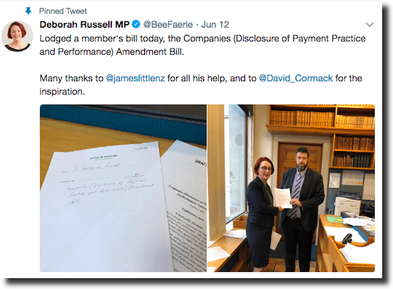 We did it! Just this week Labour MP Deborah Russell announced she was putting a members’ bill in the biscuit tin of democracy. The bill had the snappy title of “Companies (Disclosure of Payment Practice and Performance) Amendment Bill”.