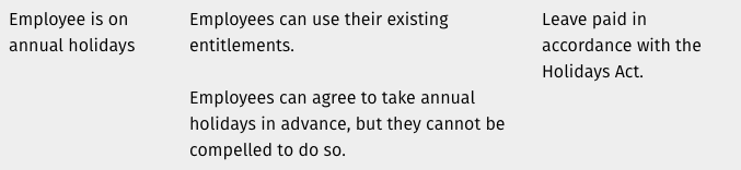 According to the Ministry of Business, Innovation and Employment, if a business has to close due to external circumstances, then it is not covered by legislation and it comes down to negotiation between employer and employee to figure out a temporary or emergency pay arrangement. If no agreement is reached, then leave without pay could be imminent. However, it always comes down to an expectation of good faith, whereby the employer is open, honest and communicative with their staff and prepared to work through any other options.