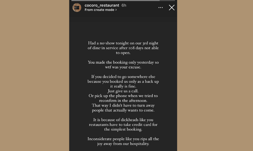 Cocoro, a Japanese fine-dining restaurant in Auckland’s Ponsonby, recently posted an Instagram story about a booking no-show soon after reopening. “It is because of dickheads like you restaurants have to take credit cards for the simplest booking,” said the post. “Inconsiderate people like you rip all the joy away from hospitality.”