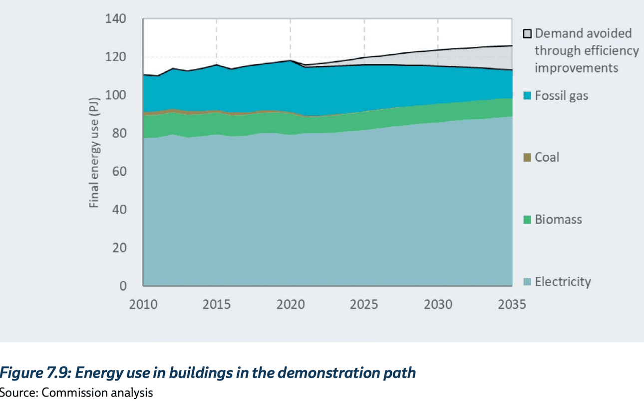 “We assume that the heat demand for existing homes reduces by 6% by 2035. We assume newly built homes require 35% less heating compared to today’s performance,” the Commission said as it published this chart.