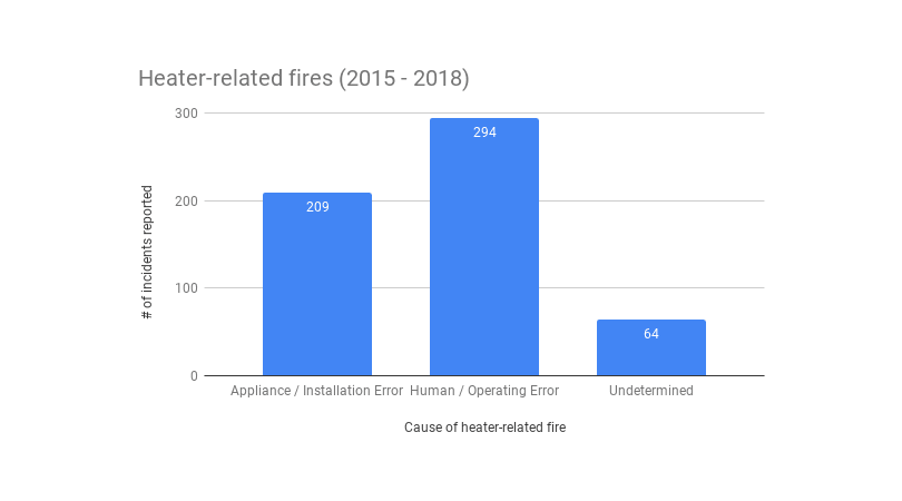 From 2010 to 2018, at least 22 indoor electric heaters have been voluntarily recalled for potential safety risks, with the most common hazard being a risk of fire. According to data provided by Fire and Emergency New Zealand, approximately 567 heater-related fires were reported in the last three years, with 209 (35.8%) of these attributed to “a failure of the appliance or installation fault”.